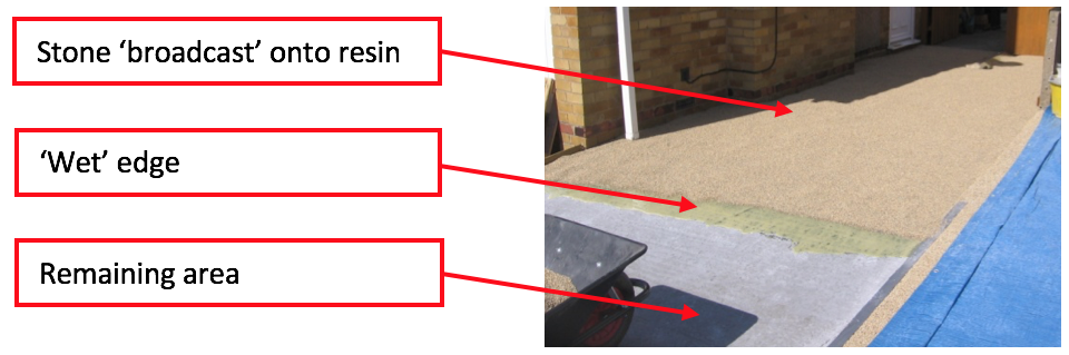 Stone should then be broadcast onto 75% of the surface by hand or a hand shovel, ensuring a WET EDGE is left for application of the next container of resin. See below