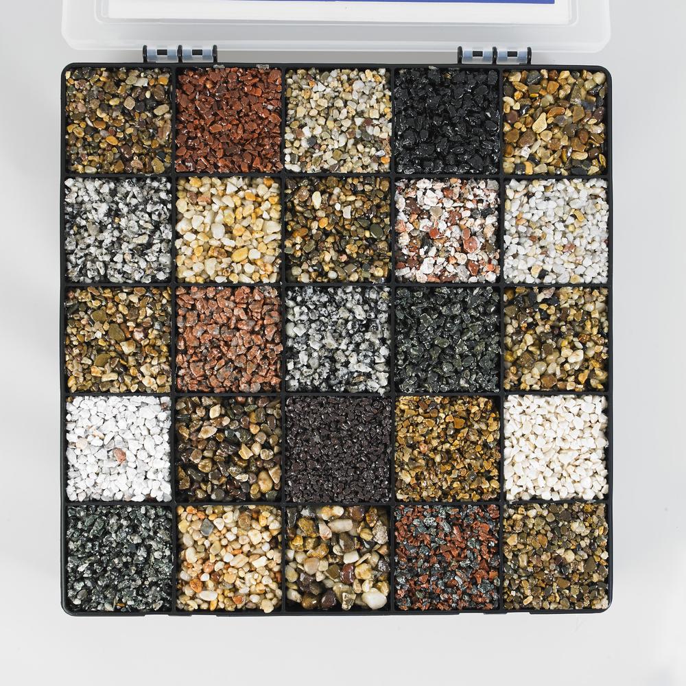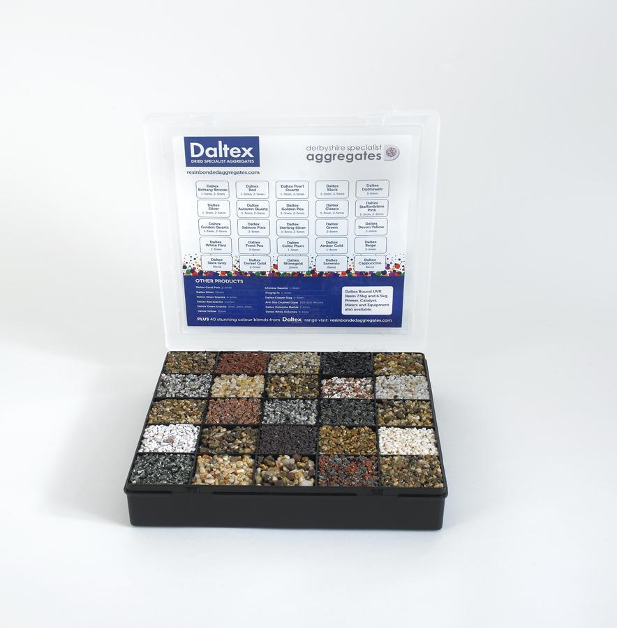Our stunning Daltex sample box is now available to order. This robust 29cm x 29cm plastic display case containing 25 samples of our aggregate and selected blends, already bound in clear resin. It also comes with the Daltex Product Guide, which contains all of our range and the technical data for all our Dried Aggregates. The perfect aid to show your customers some of the aggregate finishes available to them.